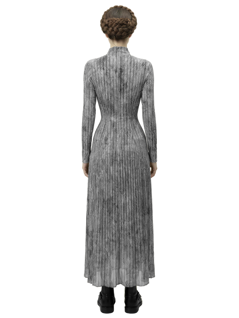 created via the devoré technique: a chemical paste is printed onto velvet silk-viscose to “burn away” the viscose pile in stripes, leaving semi-sheer silk crepe stripes alternating with opaque velvet stripes resulting in a distinctive shadowy, tone-on-tone striped texture that almost looks tie-dyed or marbled in places.
